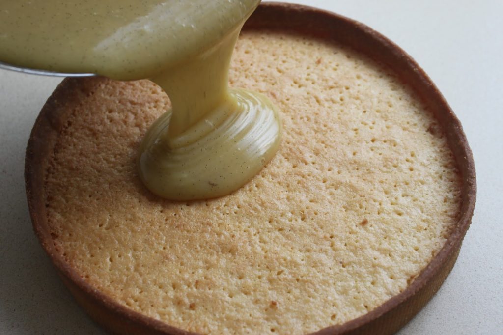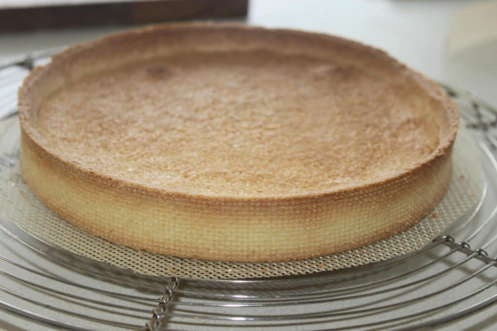 - Je n’ai pas pris de plaque de cuisson, j’ai pris le fond d’un moule à manqué à bord amovible. Pourquoi? Car les plaques de cuisson ont une fâcheuse tendance à se tordre sous l’effet de la chaleur. Après le repos au frais, faites cuire le fond de pâte à 175°C pendant 18 minutes. Sortez le cercle du four, versez la crème d’amande au citron (il faut la sortir au moins 1 heure avant du réfrigérateur). Avec la chaleur elle va fondre et s’étaler.