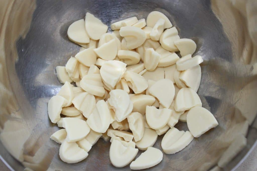 Pour la ganache merveilleuse à la vanille, placez la couverture ivoire dans un récipient. J’ai pris ici la marque Valrhona.