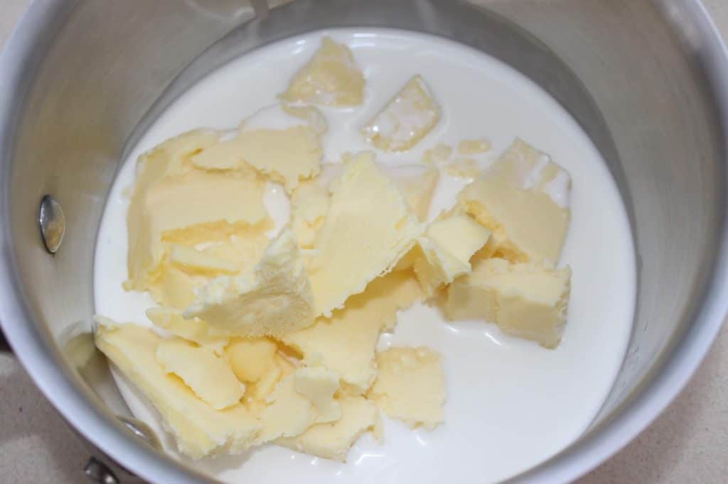 - Placez la crème et le beurre coupé en morceaux dans une petite casserole.