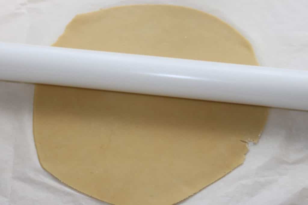 - Étalez la pâte sur un morceau de papier sulfurisé sur une épaisseur de 3-4mm. Il y a assez de pâte pour plusieurs tartes.