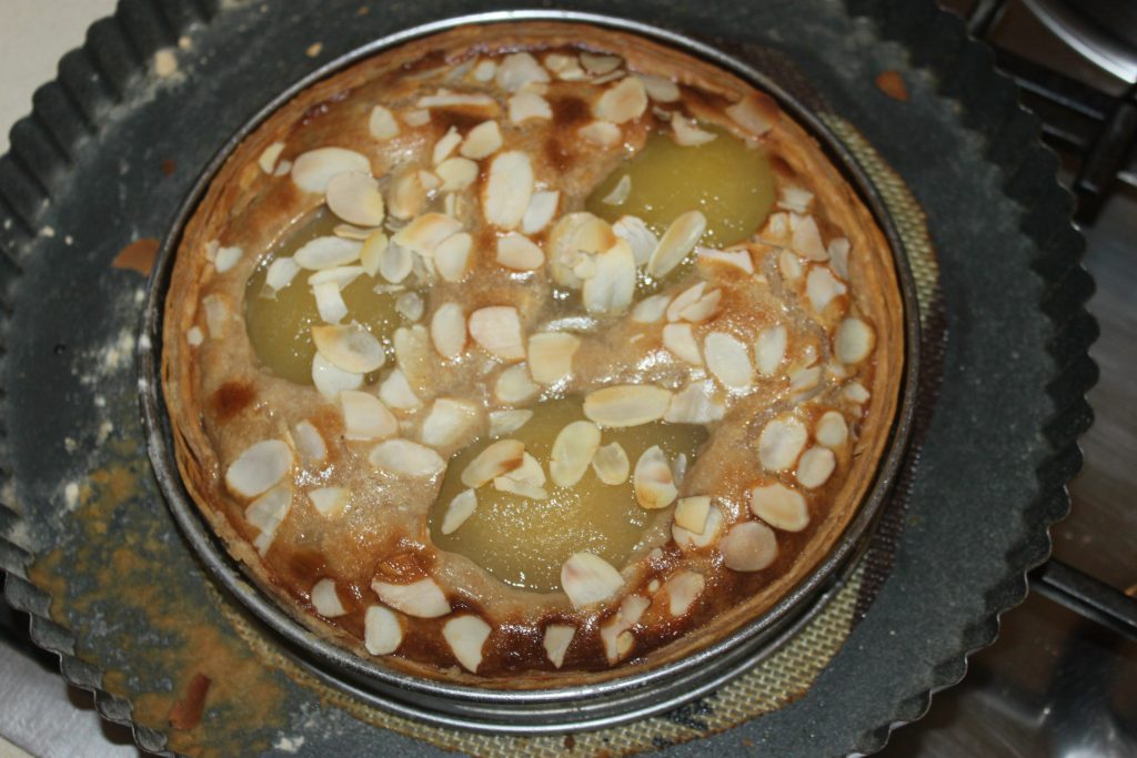 Versez deux trois cuillerées à soupe de crème de marron dans le fond de pâte précuit. Si la pâte avait malgré tout gonflé, écrasez-la doucement en mettant la crème. Posez les demi-poires. Ici pour le moment deux, j’en ai mis au final 3 moitiés, mais pour la tarte de la dimension que je vous donne, vous mettrez sans doute les 6 demi-poires cuites.