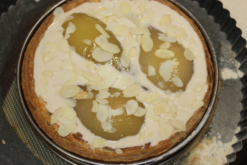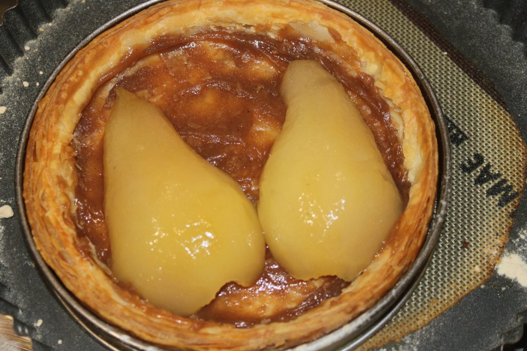 - Versez deux trois cuillerées à soupe de crème de marron dans le fond de pâte précuit. Si la pâte avait malgré tout gonflé, écrasez-la doucement en mettant la crème. Posez les demi-poires. Ici pour le moment deux, j’en ai mis au final 3 moitiés, mais pour la tarte de la dimension que je vous donne, vous mettrez sans doute les 6 demi-poires cuites.