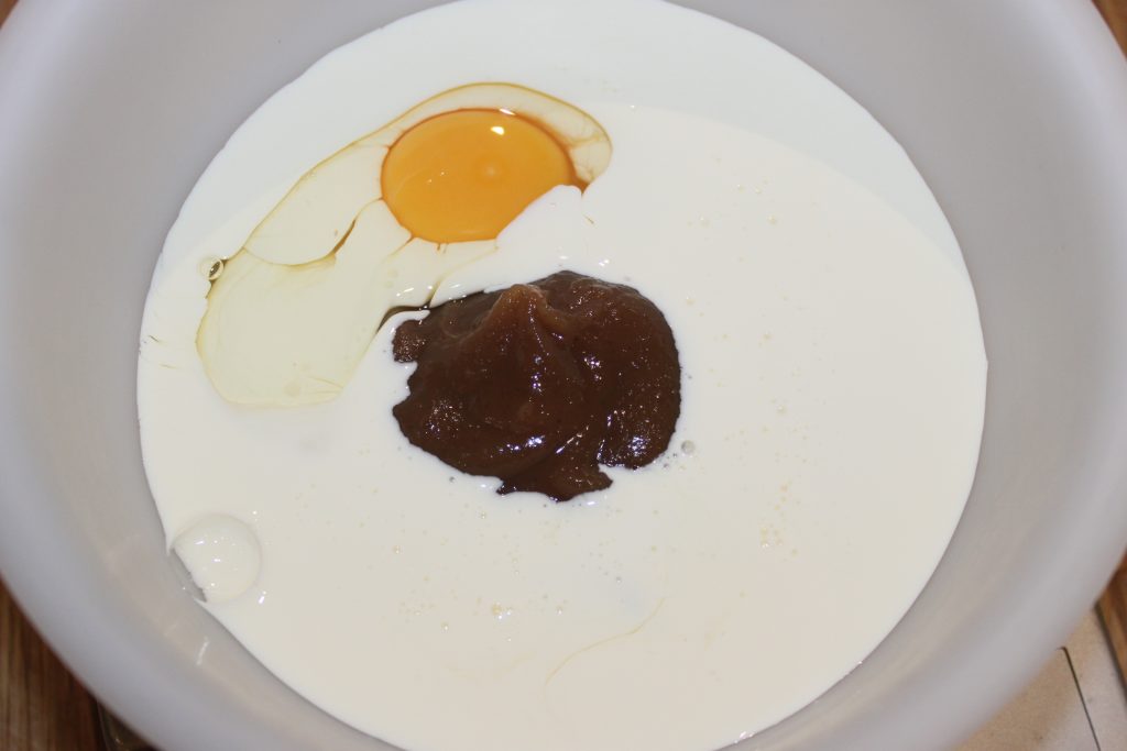 - Pour l’appareil, mettez l’œuf, la crème liquide entière et la crème de marron dans un récipient et mélangez bien à la fourchette.