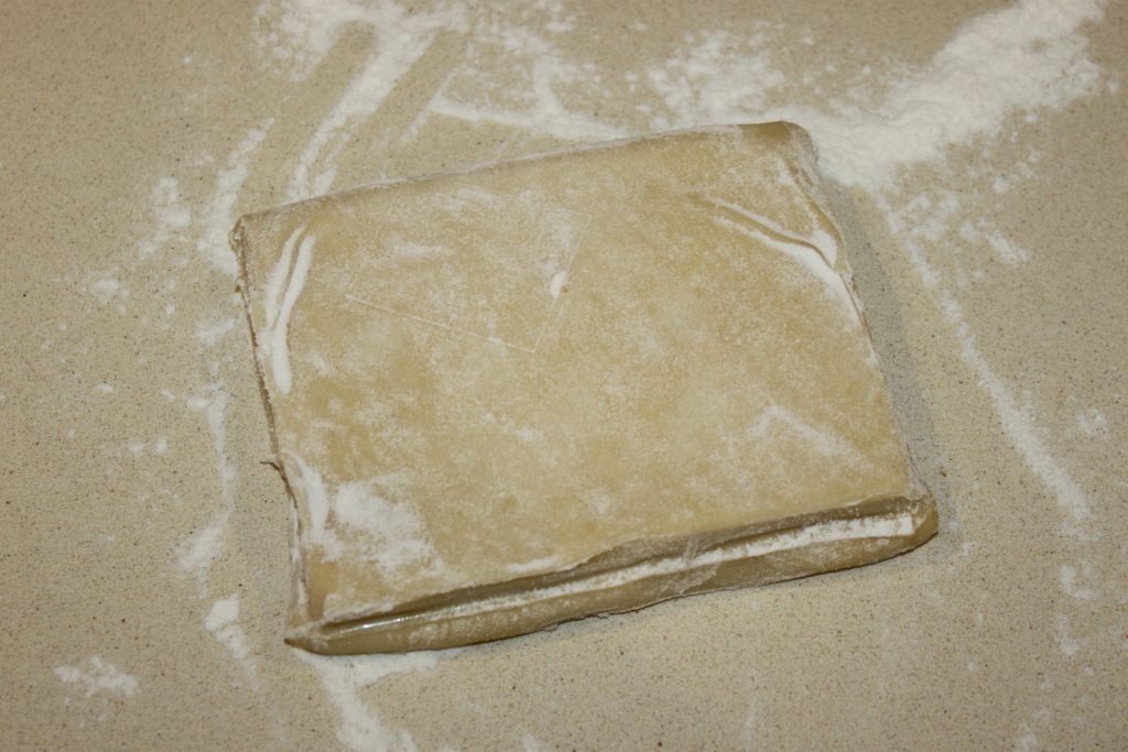 - Étalez la pâte feuilletée sur 2-3 mm d’épaisseur sur un plan de travail fariné.