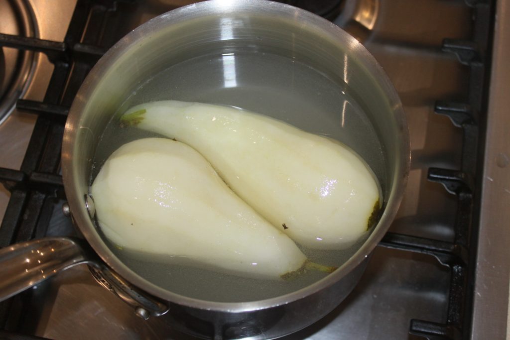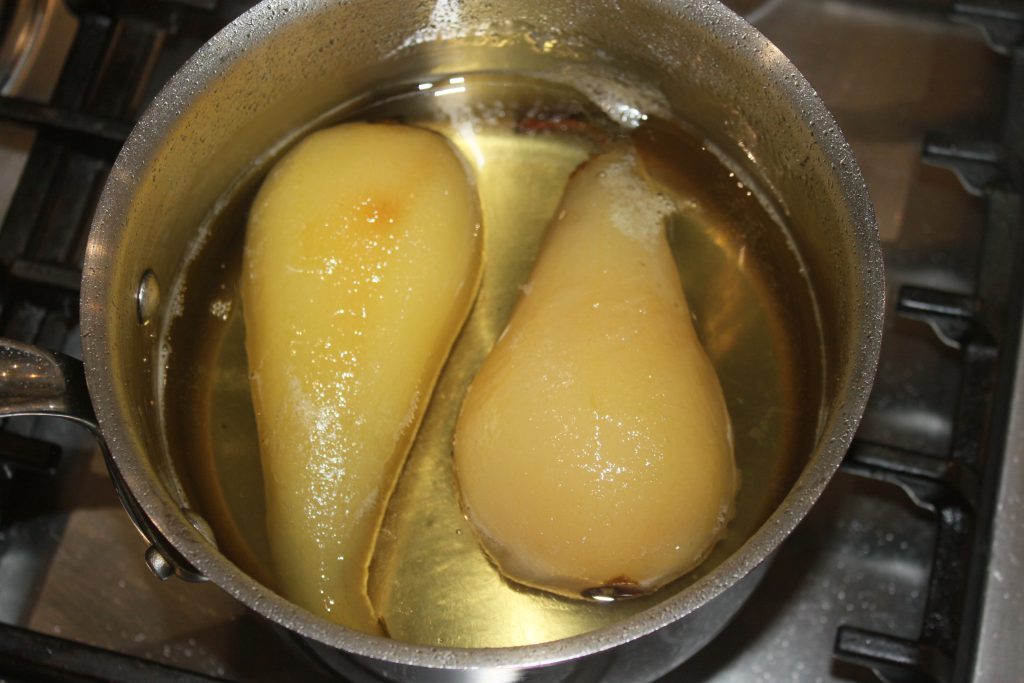 - Baissez le feu pour laisser un frémissement et laissez cuire 25-30 minutes en retournant les poires de temps en temps. Coupez ensuite le feu et laissez les poires dans le sirop jusqu’à ce que celui-ci soit à température ambiante.