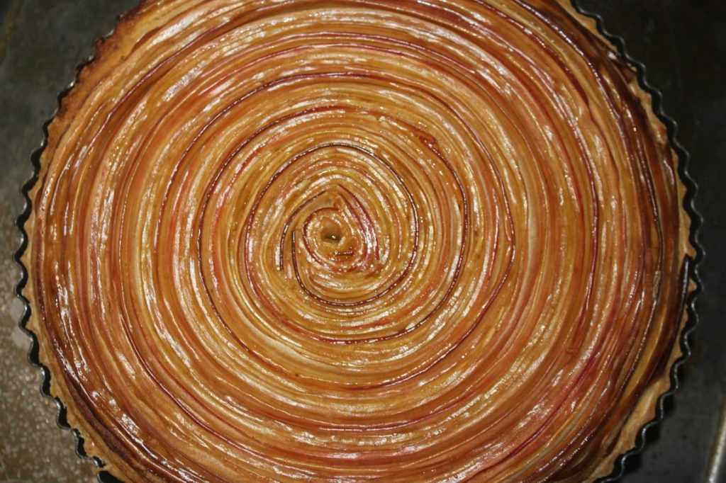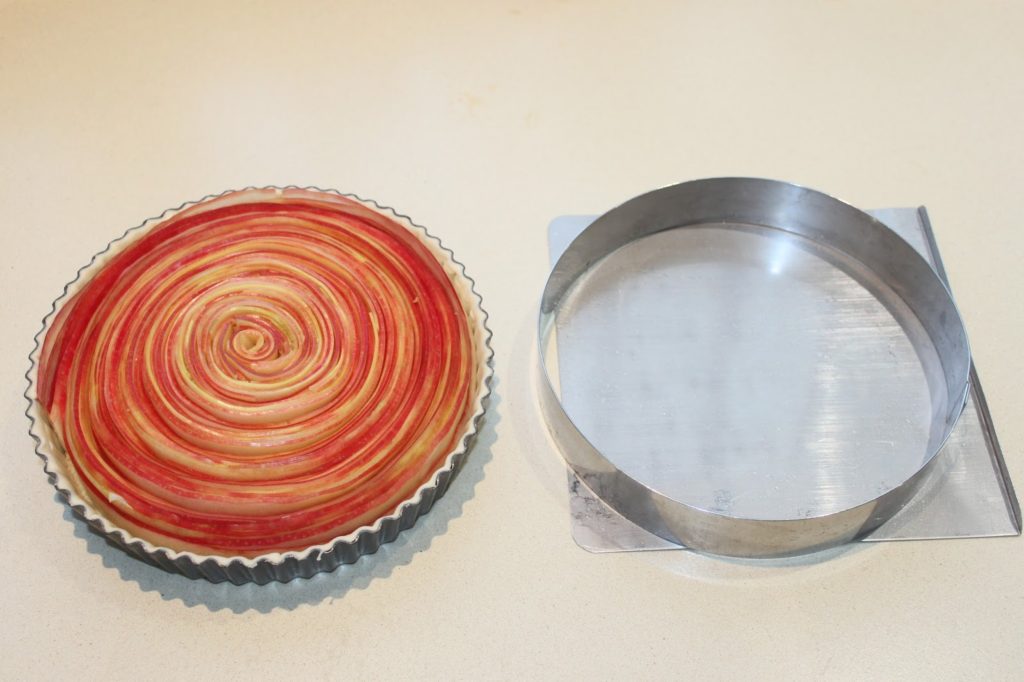 Pour poser la spirale de pommes, j’ai pris une sorte de pelle et j’ai bloqué le disque avec un cercle à tarte. J’ai glissé la spirale sur la crème d’amande.