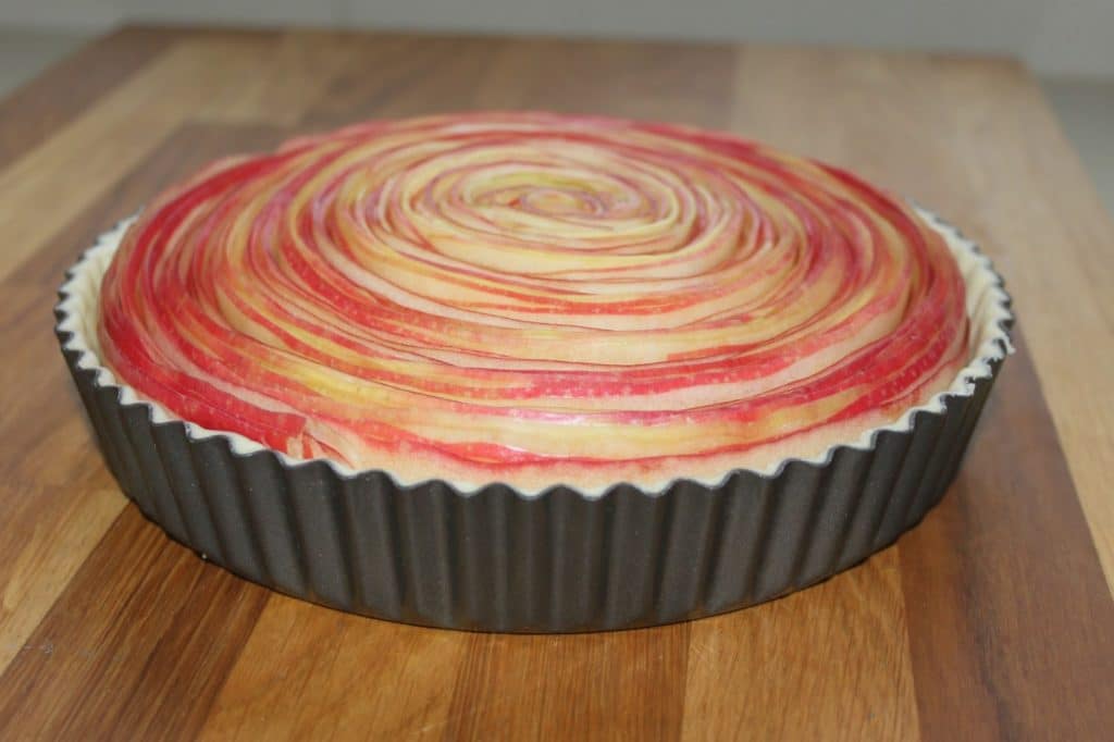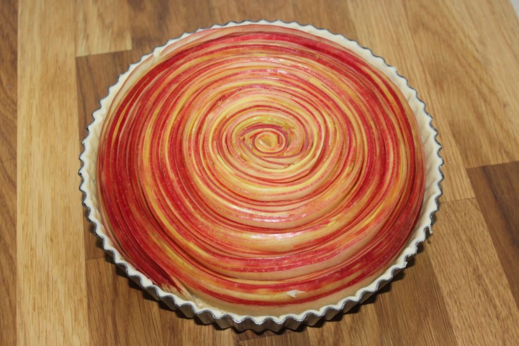 - Encore une fois, ici ce sont les étapes pour l’ustensile. Sans, disposez simplement des tranches de pommes sur la crème d’amandes comme le feriez pour une tarte aux pommes classique !