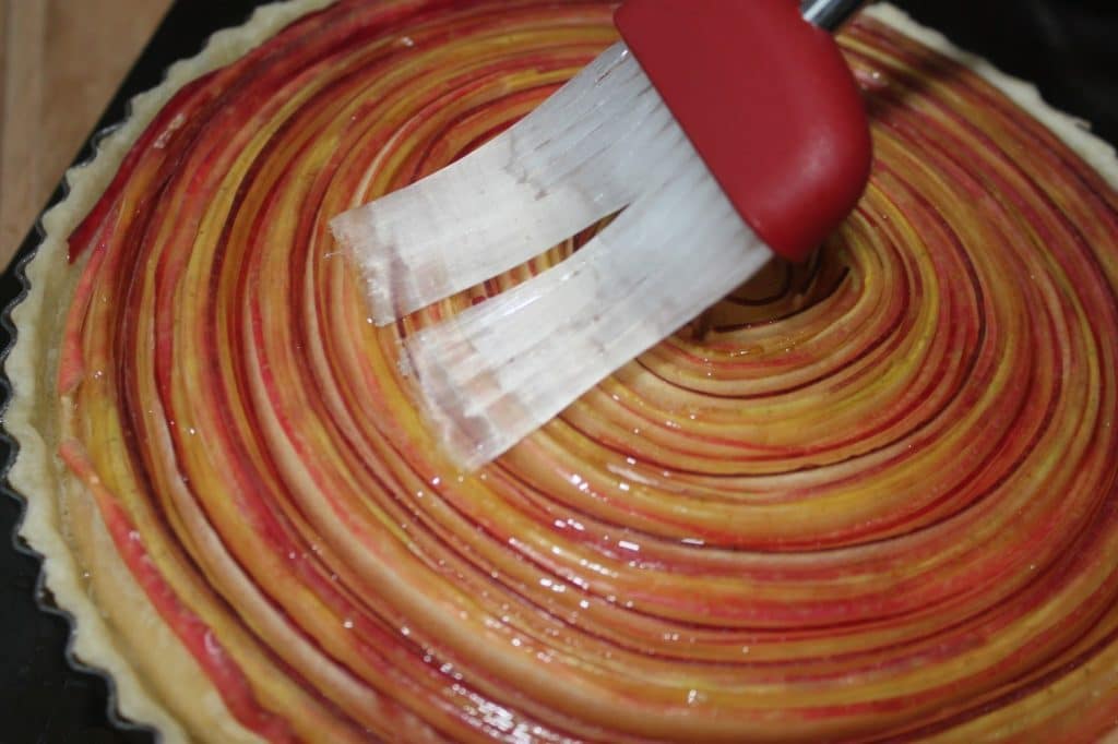 - Passez au pinceau un peu de sirop de sucre de canne sur la surface du disque de pommes. Cela va permettre d’aider la cuisson des pommes.