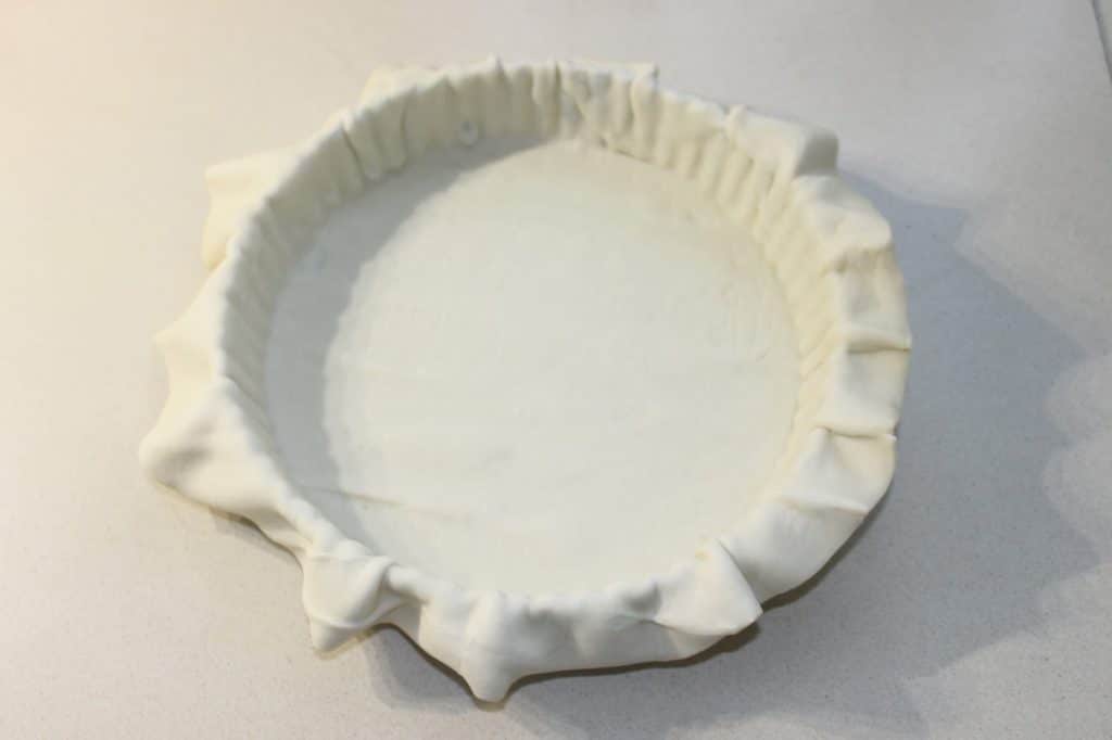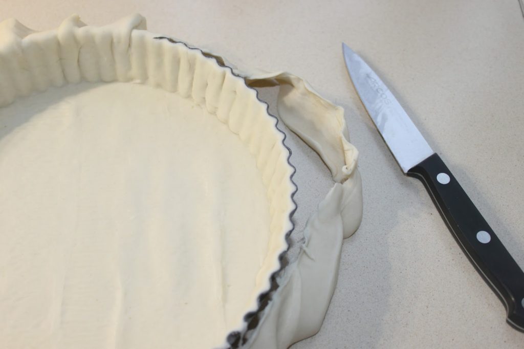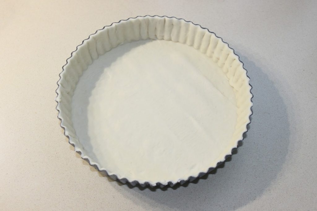 - Garnissez le moule à tarte de pâte feuilletée étalée. Assurez-vous d’avoir un angle droit dans le fond du moule.
