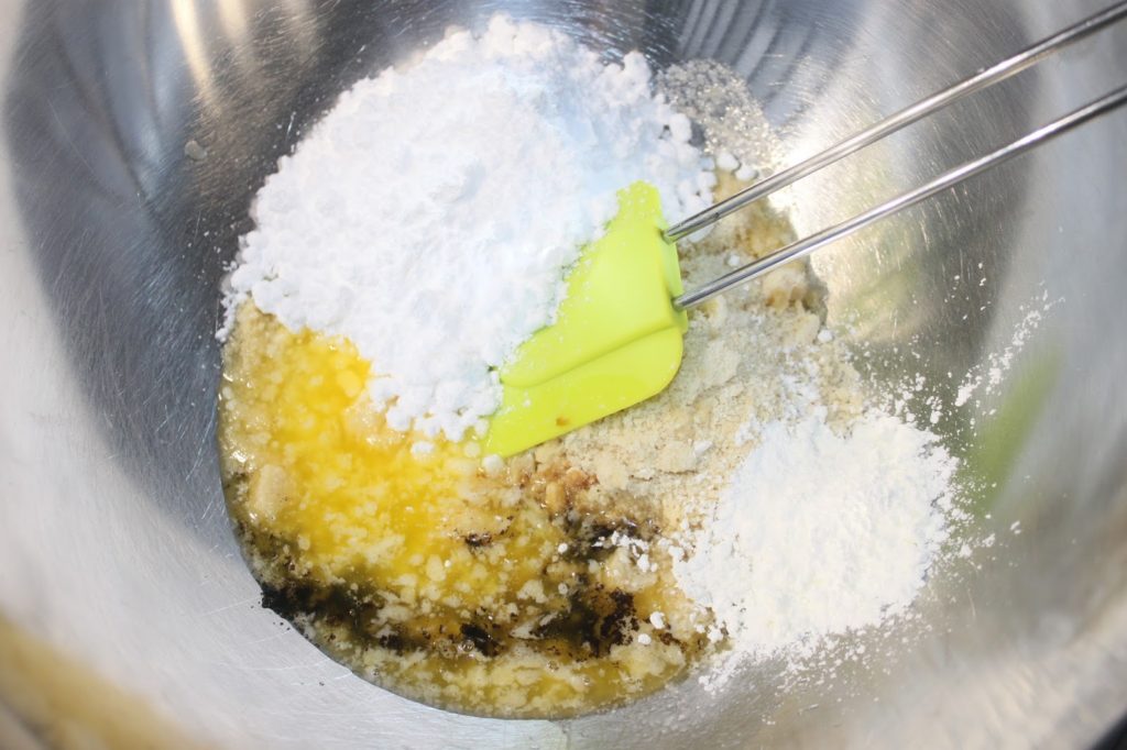 Dans un récipient, mélangez le beurre demi-sel fondu, le sucre, la poudre d’amande, le rhum, la maïzena les 30g d’œuf (pour cela battez un œuf en omelette et versez-en la quantité nécessaire), la vanille liquide et un peu de vanille en poudre (ou l’intérieur d’une gousse de vanille).