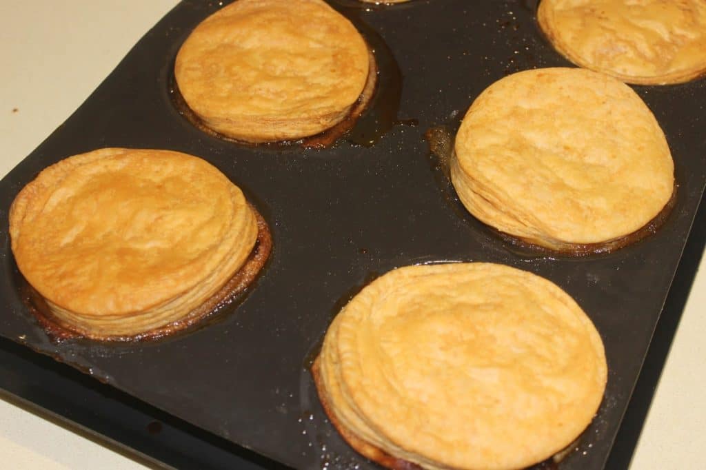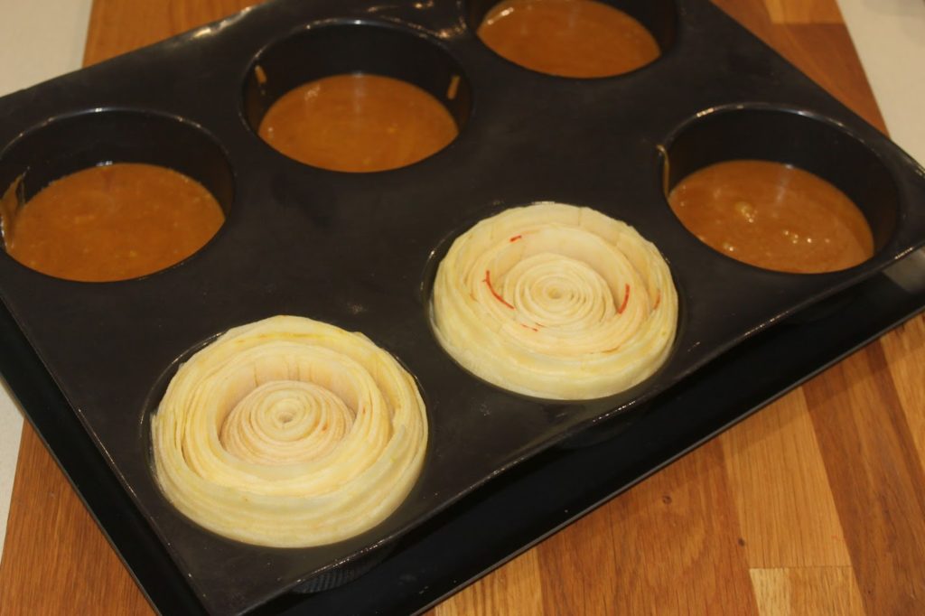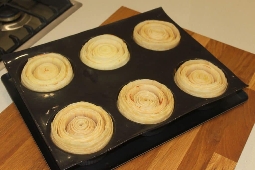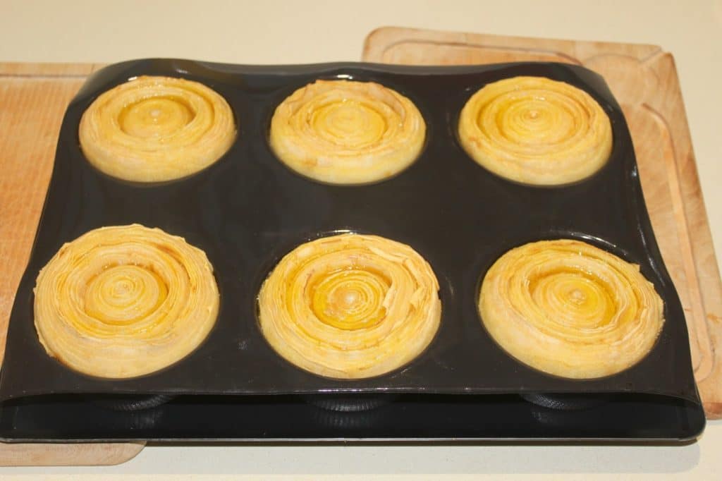 Versez alors le caramel dans les 6 moules à tatin. Pour cette recette, j’ai pris des moules flexipan, pro, que j’ai achetés en ligne.