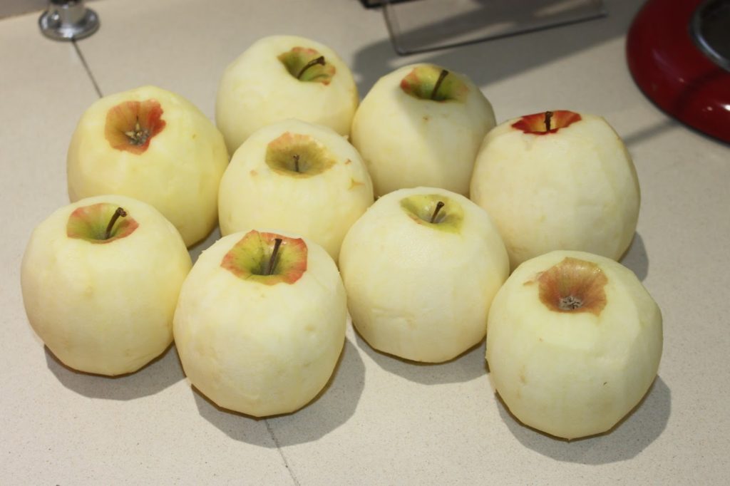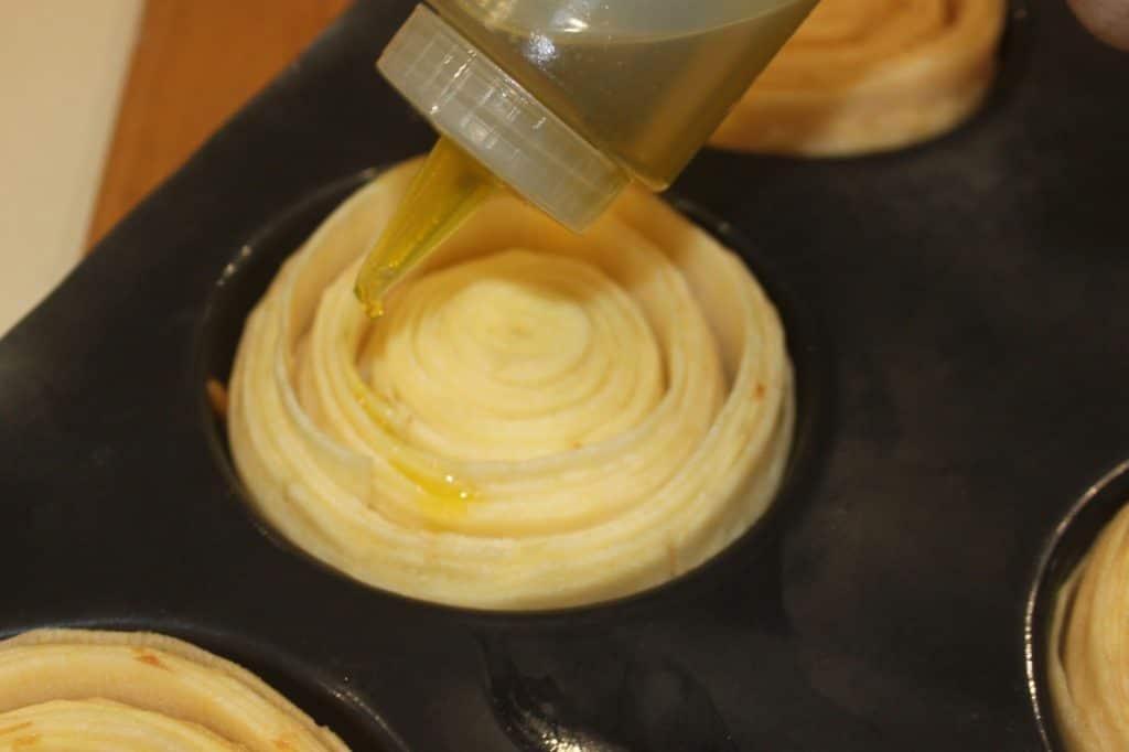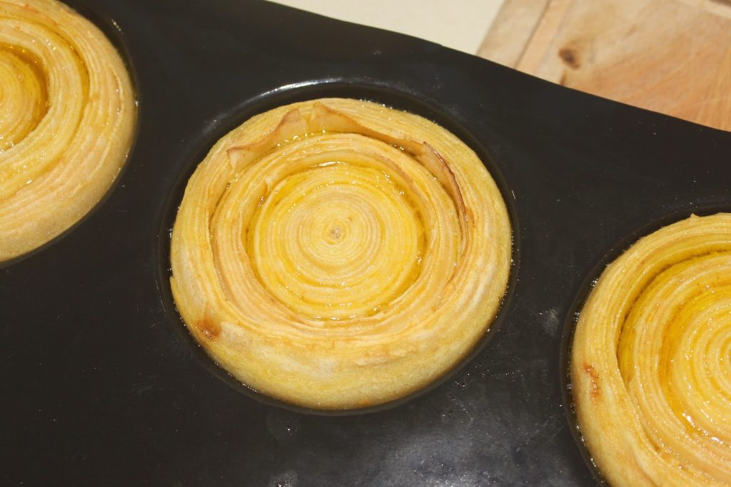 Enroulez de nouveau trois pommes que vous couperez en deux pour faire deux tatins. Il faut donc concrètement 1,5 pommes par moule, d’où les 9 pommes pour les 6 moules.