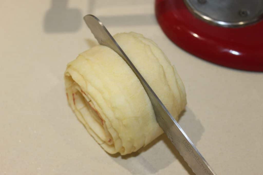Je vous avais déjà parlé de cet ustensile génial pour couper les lanières de pommes dans ma tarte spirale aux pommes, voir la recette ICI ! On peut débiter une pomme entière en une longue bande de plus de 2 mètres.