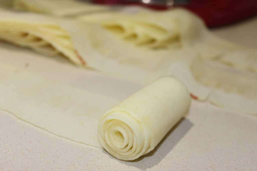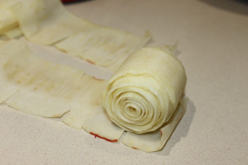 Une fois les pommes coupées, prenez une lanière d’une pomme. Commencez à enrouler (dans le sens d’enroulement naturel du fruit) par le côté le plus large en serrant le plus possible.