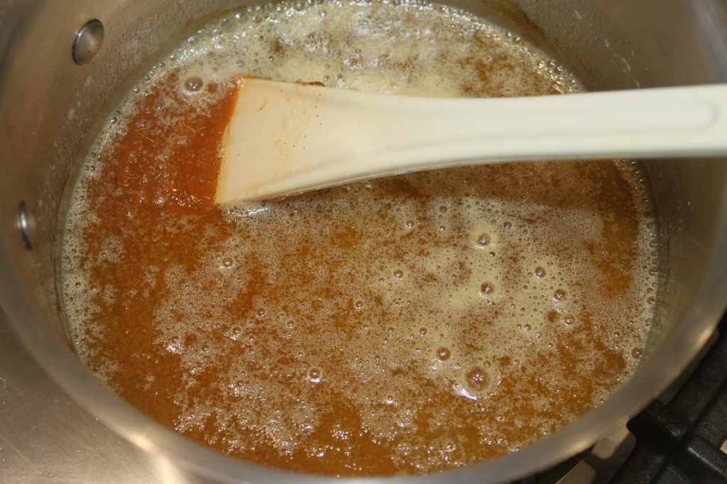Au départ vous allez avoir un caramel où le beurre est apparent. Baissez le feu et mélangez bien pour finalement un caramel homogène.