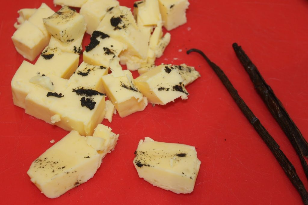 Récupérez l’intérieur des gousses de vanille. Ici j’ai la vanilline avec le beurre pour ensuite tout verser d’un coup.