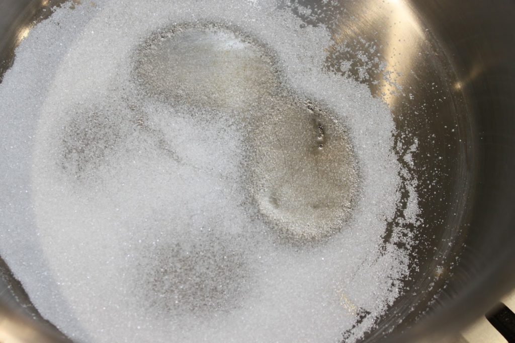 Tout d’abord, faites votre caramel. Je ne le prépare ici à sec. Faites chauffer une casserole sur feu modéré, puis versez une petite quantité de sucre (sur les 400).