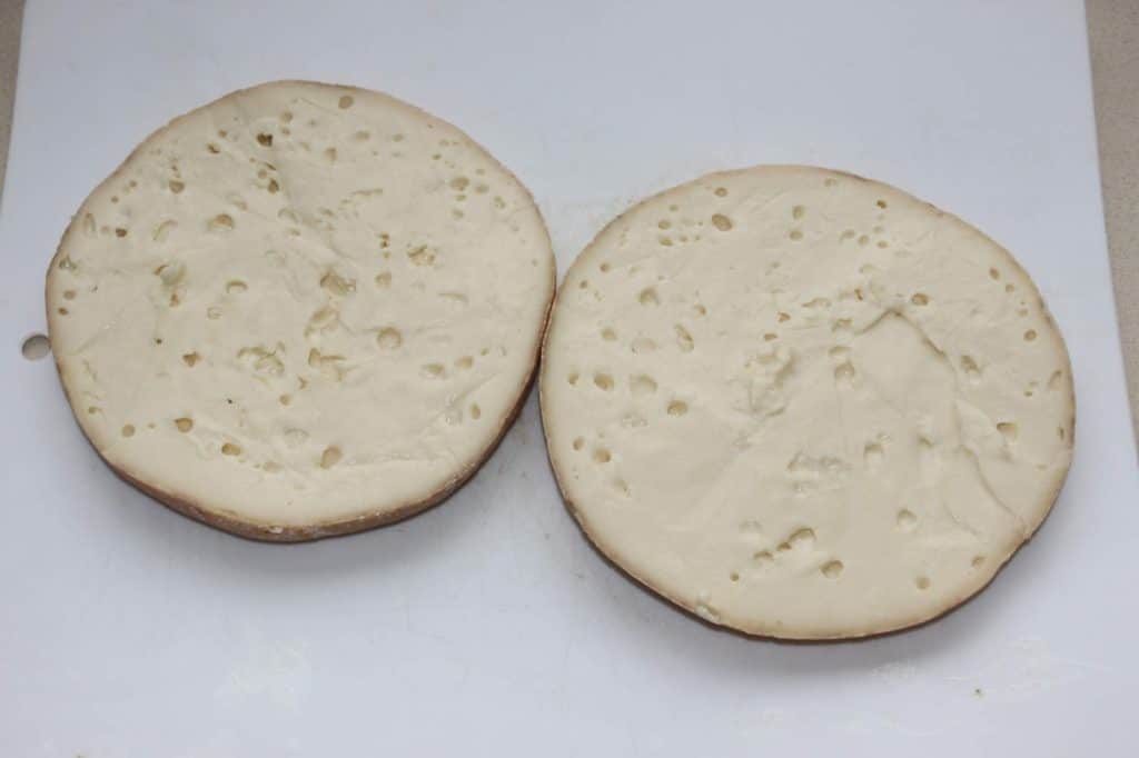 Colocar las mitades del Reblochon una sobre otra, con la corteza hacia arriba.