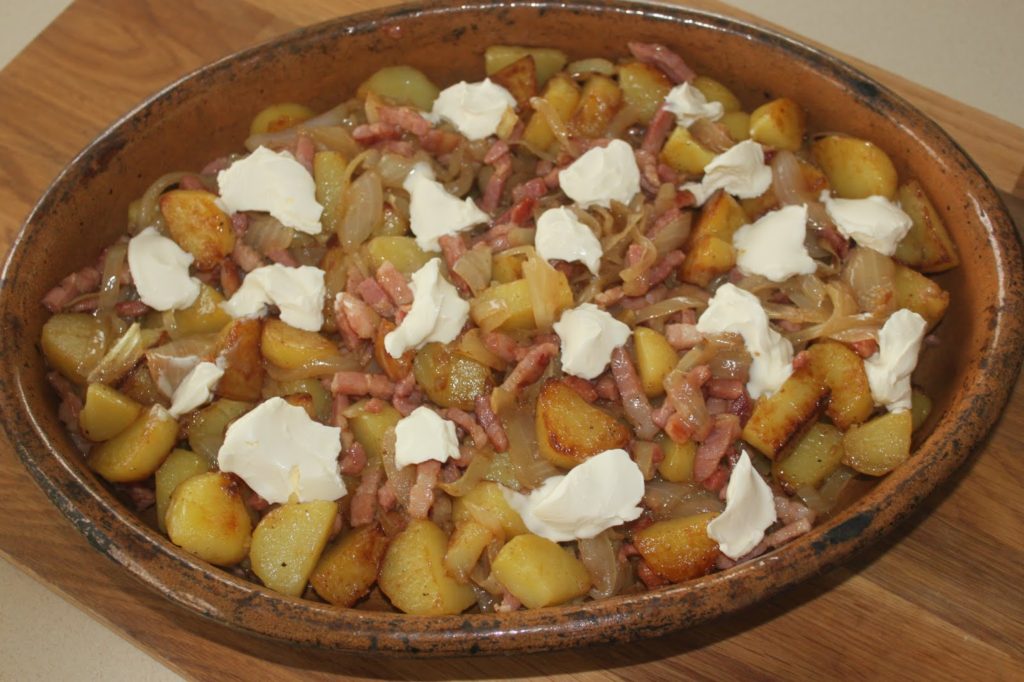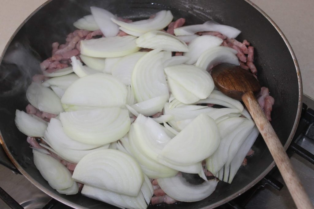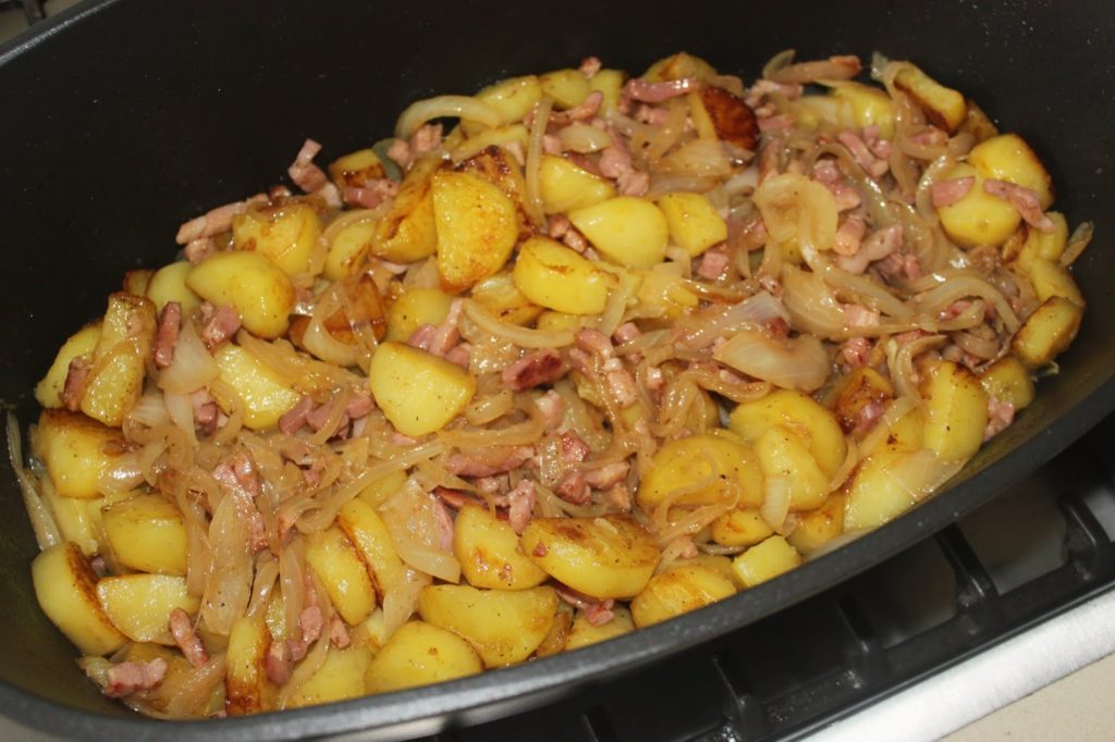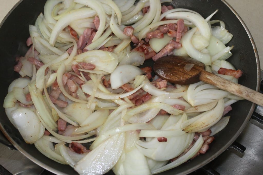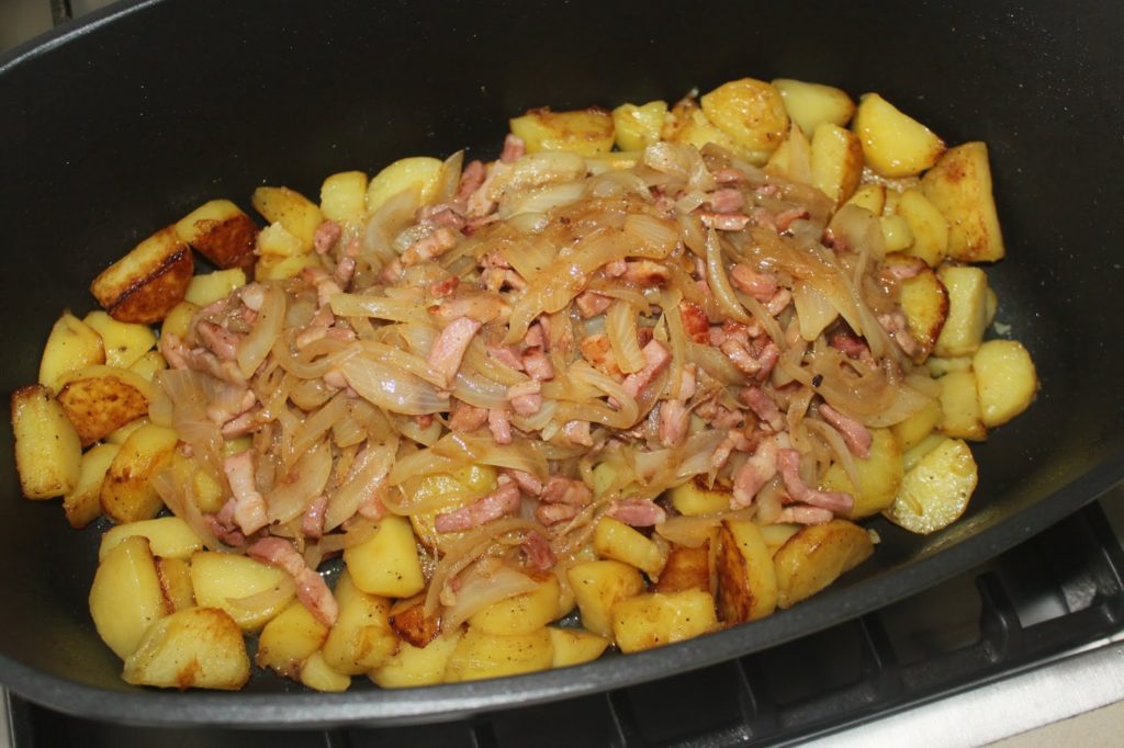 Cuando las patatas estén cocidas y doradas, vierte el bacon/las cebollas.