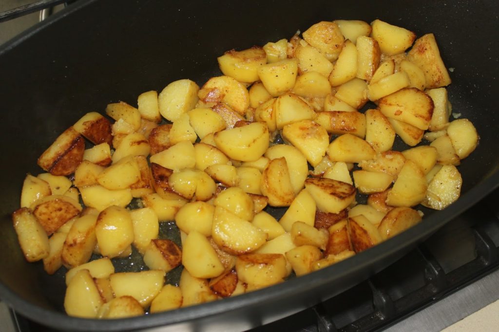 Le pongo una tapa y lo dejo cocer de 20 a 25 minutos, vigilando. Me aseguro de que las patatas se cocinen y doren al mismo tiempo. Tenga cuidado de no dañarlos . Puedes añadir sal y pimienta a las patatas.