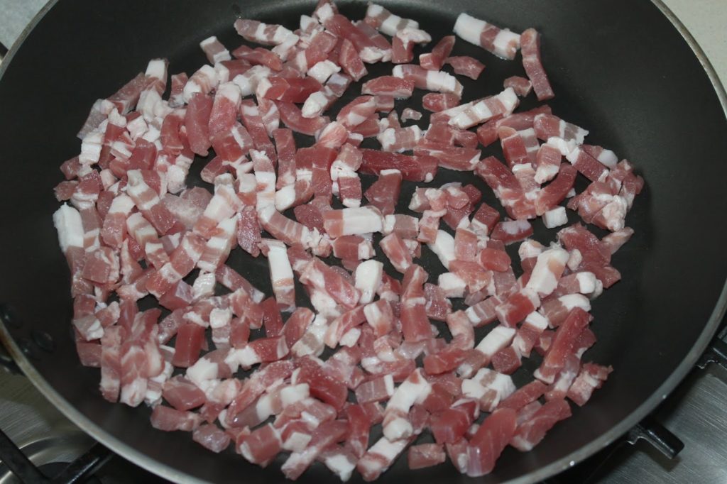 Mientras tanto, vierta los lardones en una sartén a fuego alto.