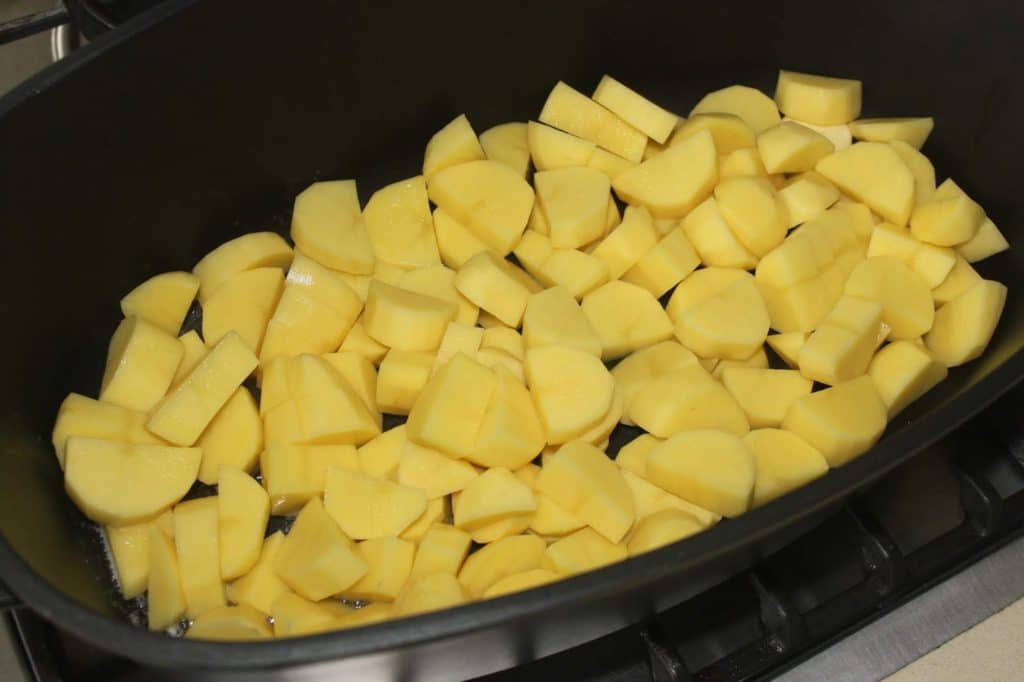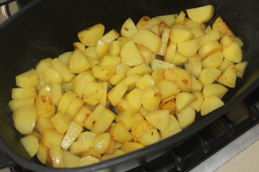 Cortar las patatas en trozos y ponerlas en la cazuela a fuego moderado.