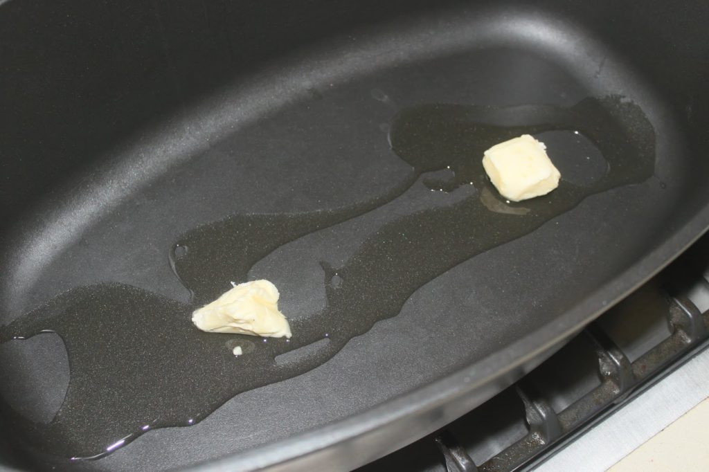 Poner la mantequilla y el aceite en una sartén. Aquí uso una cazuela que es perfecta para cocinar las patatas ya que no se pegan en absoluto.