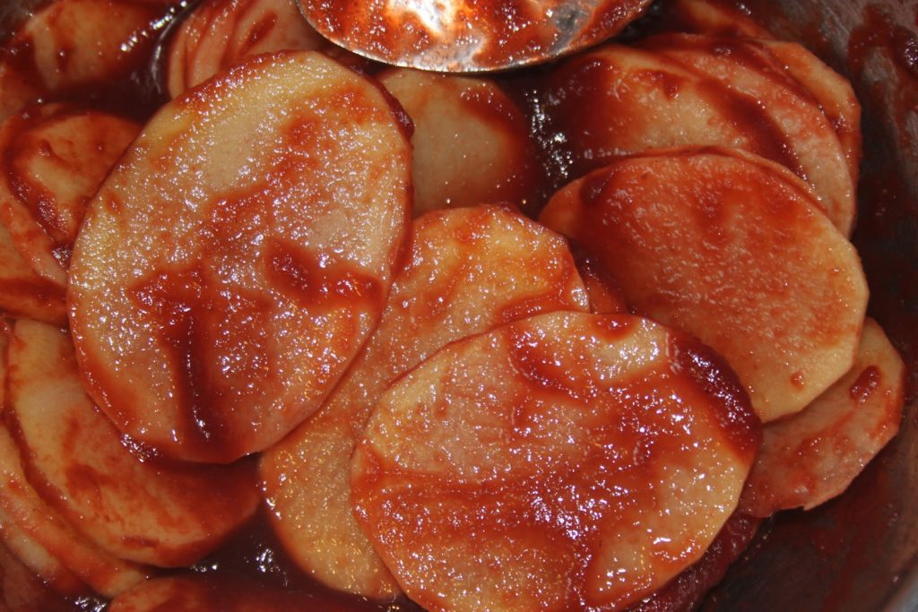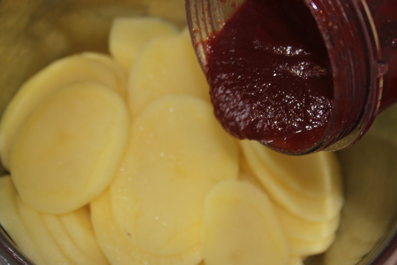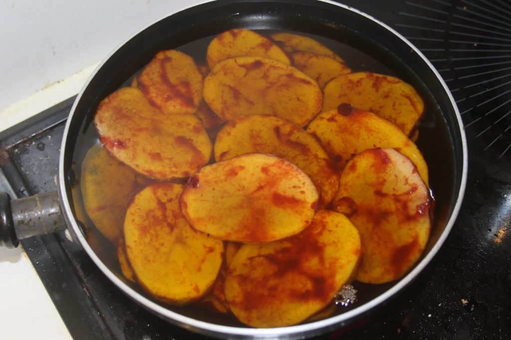 - Remplir à moitié une petite poêle d’huile d’olive. Mettre sur feu doux à modéré et ajouter les pommes de terre sans le jus de betteraves. Laisser mijoter pendant une bonne vingtaine de minutes jusqu’à ce que les pommes de terre soient tendres.