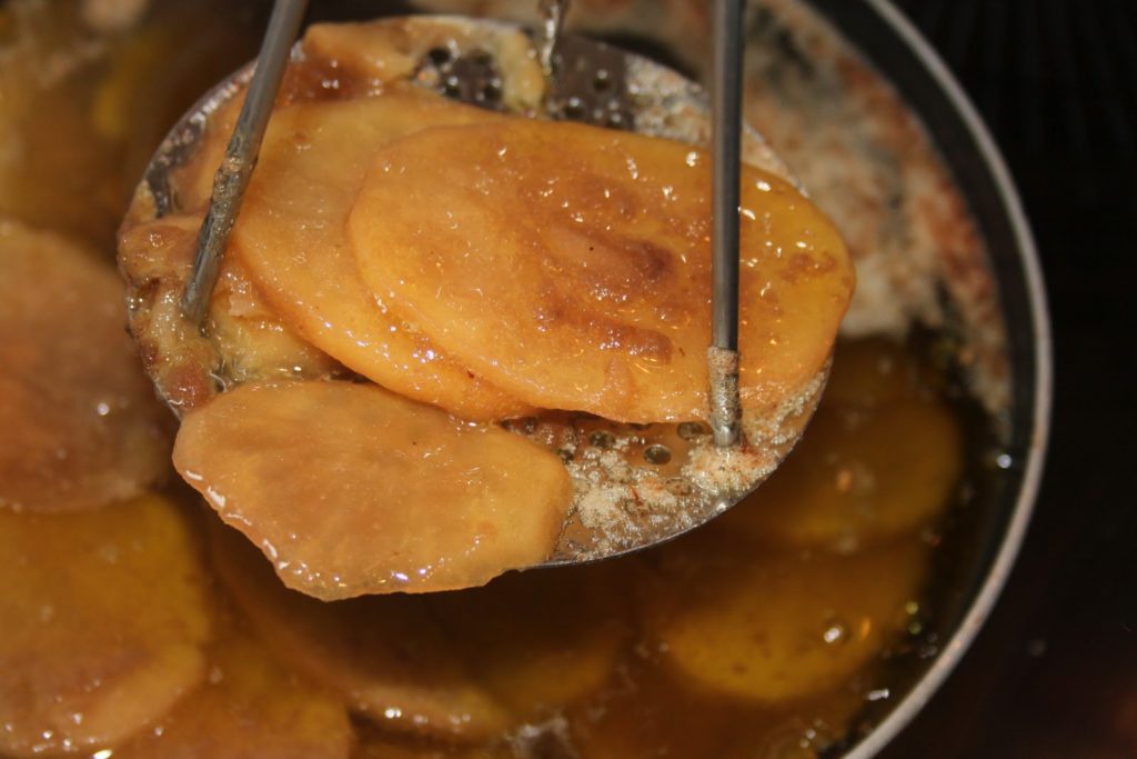- Quand les pommes de terre sont bien tendres, les enlever de l’huile.