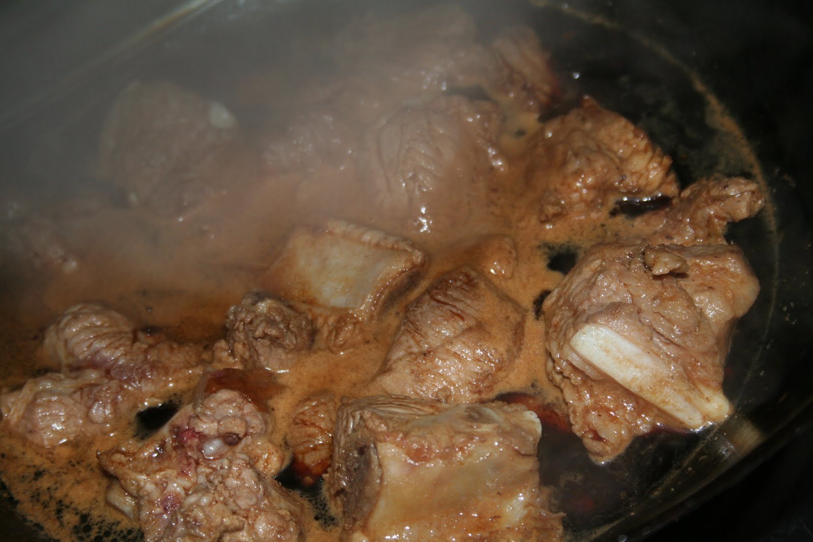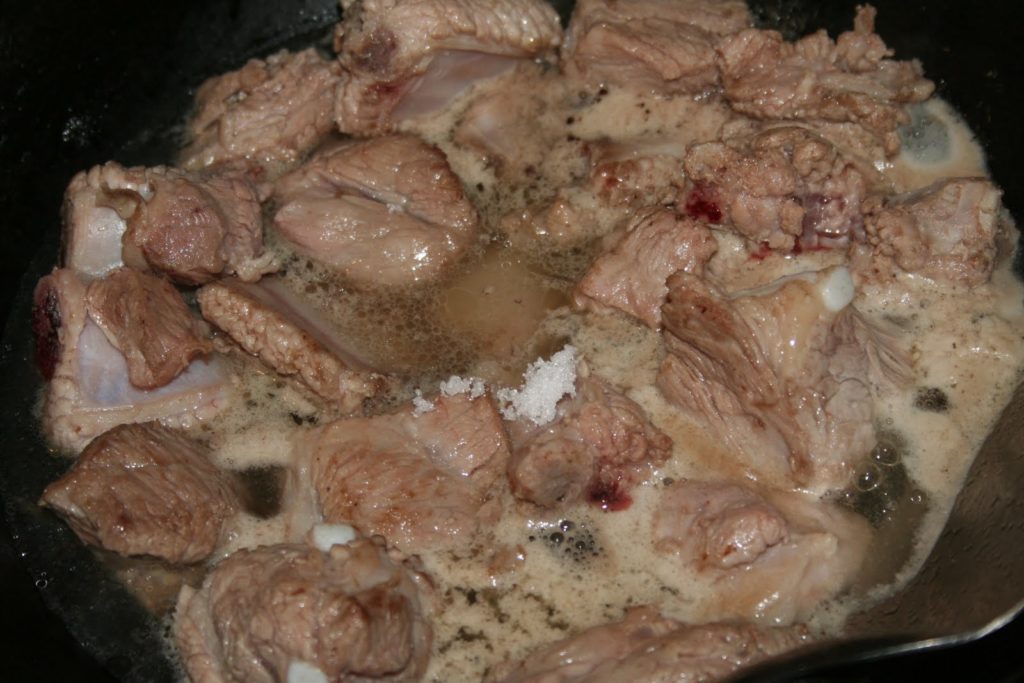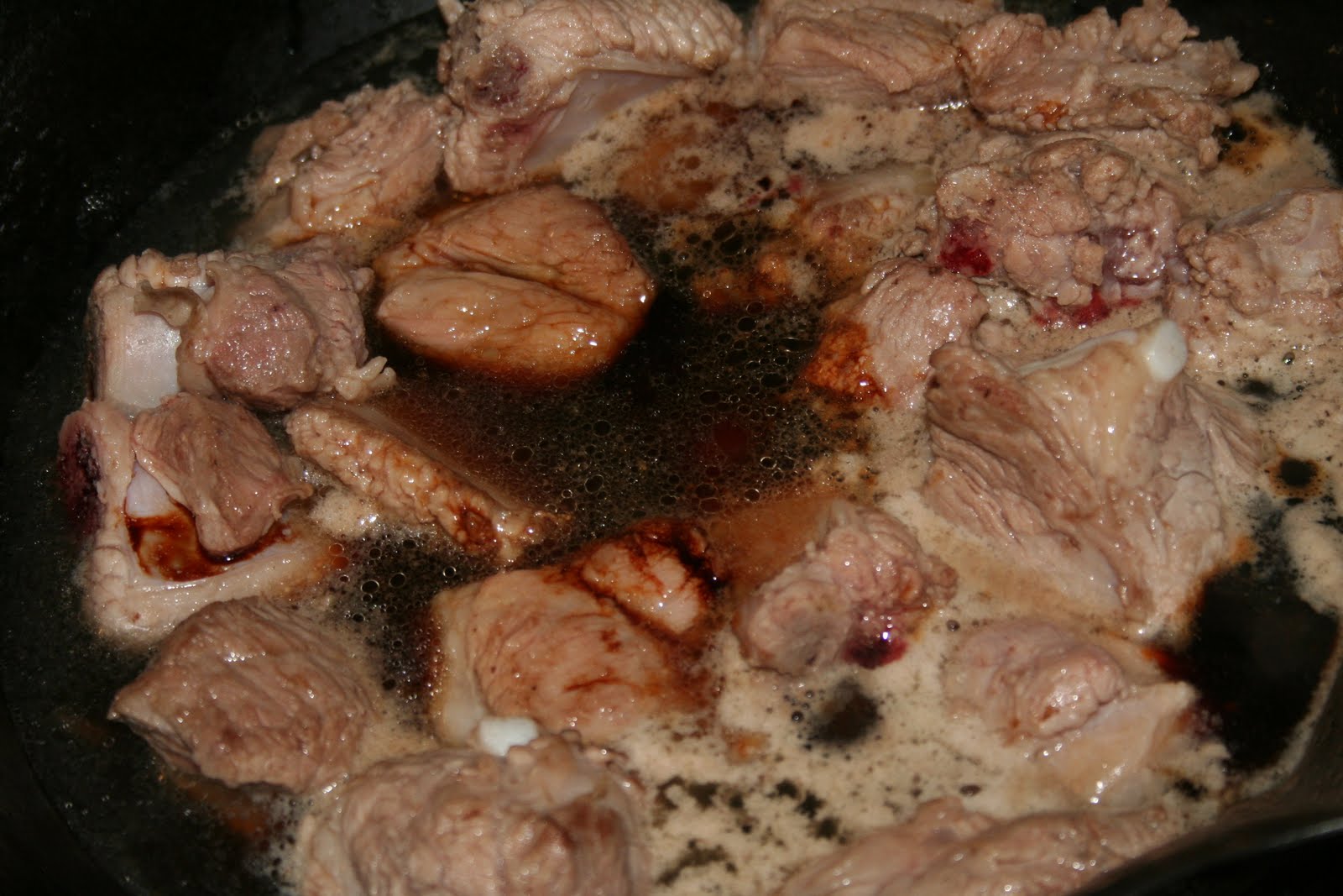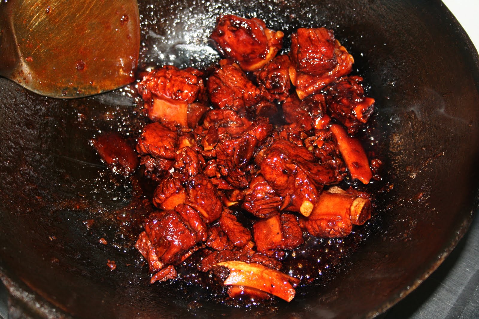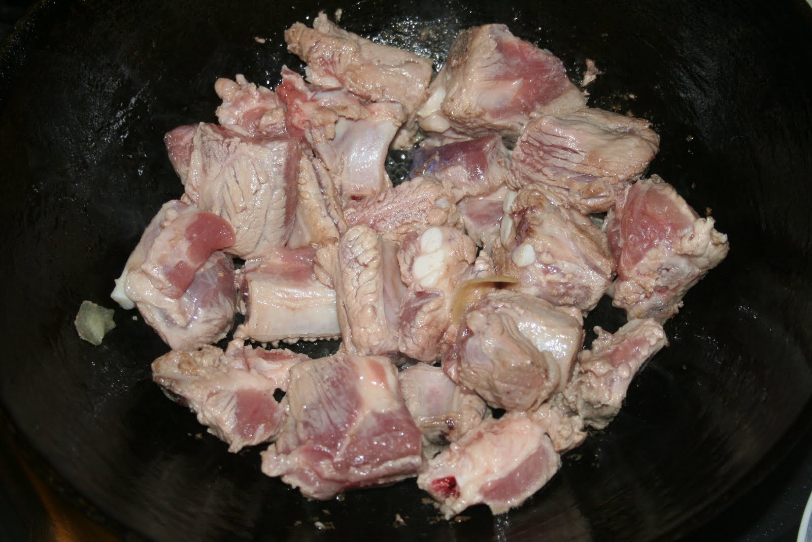 Ajouter les travers de porc en morceaux et bien mélanger toujours sur feu assez vif.