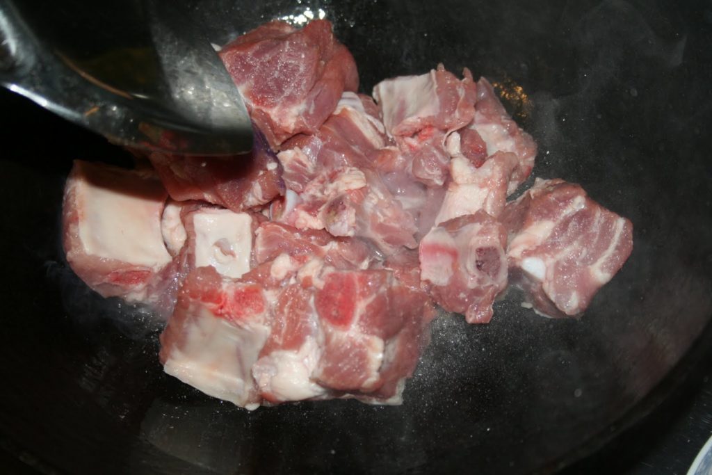 - Ajouter les travers de porc en morceaux et bien mélanger toujours sur feu assez vif.