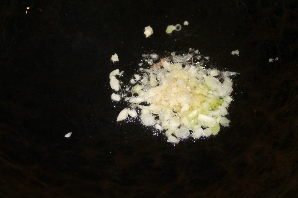 Mettre une cuillerée à soupe d’huile dans le wok sur feu assez fort. Ajouter le gingembre en petits morceaux.