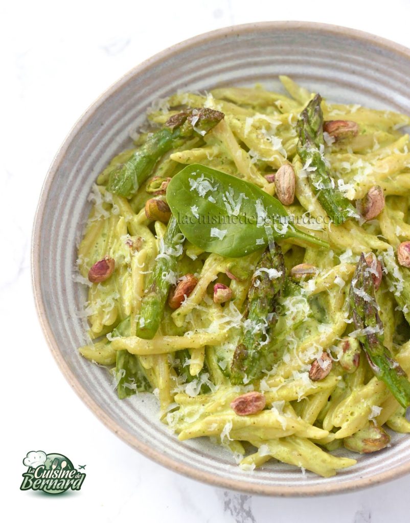 Trofie au pesto de pistache, pecorino et pousses d'épinards, asperges vertes