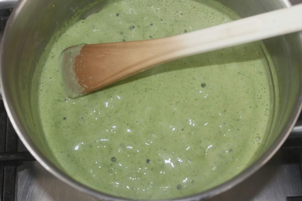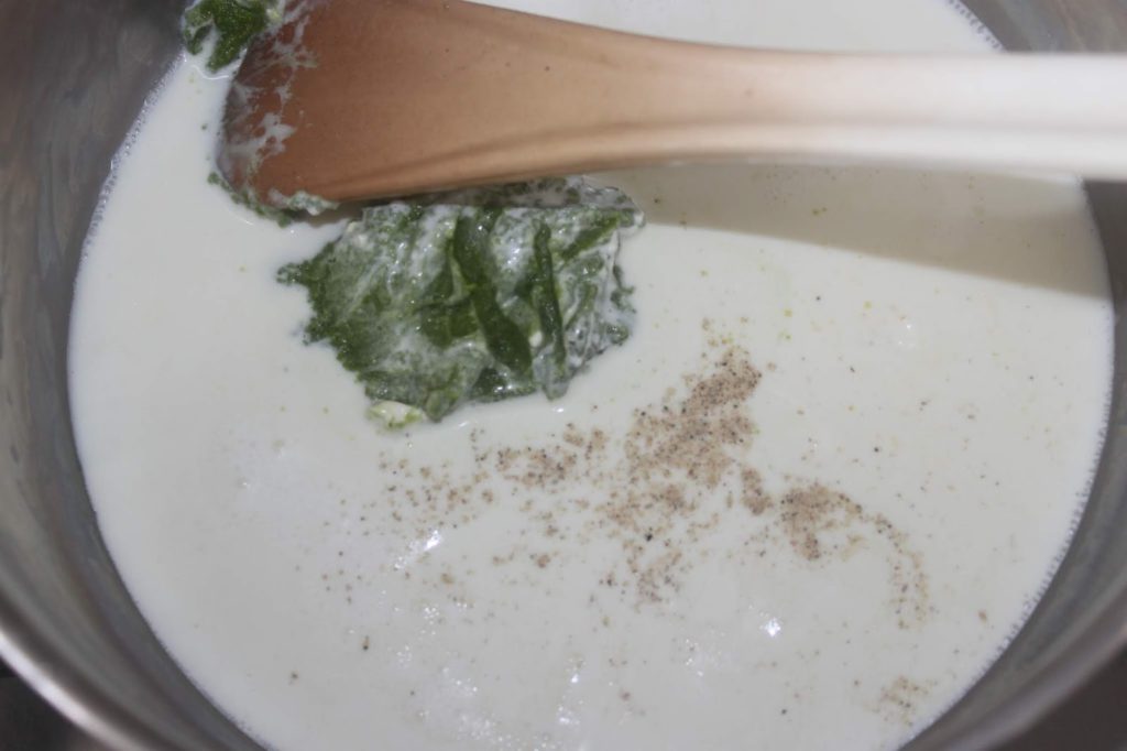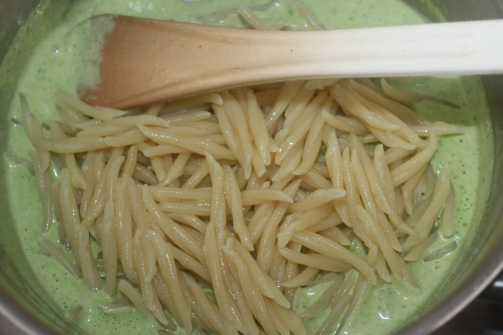 - Quand tout est prêt, versez deux bonnes cuillerées à soupe de pesto dans la crème liquide entière sur feu modéré. Salez et poivrez.