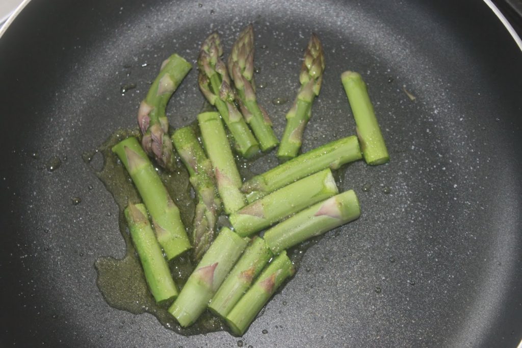 - Lavez les asperges. Coupez les en tronçons en enlevant la base trop fibreuse. Versez un peu d’huile d’olive dans une poêle sur feu soutenu. Ajoutez les morceaux d’asperge. Faites les revenir 7-8 minutes.