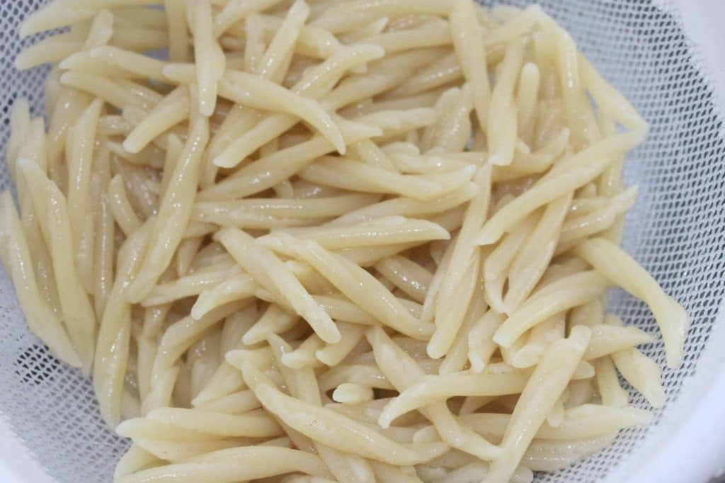 - Faites-les cuire une minute de moins que le temps de cuisson « al dente ». Égouttez-les bien puis refroidissez-les à l’eau froide. Égouttez de nouveau.