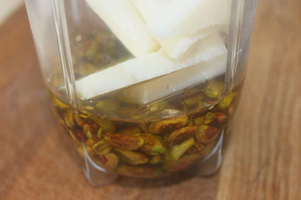 - Mettez les pistaches crues, le pecorino, la gousse d’ail et l’huile d’olive dans un petit mixeur.