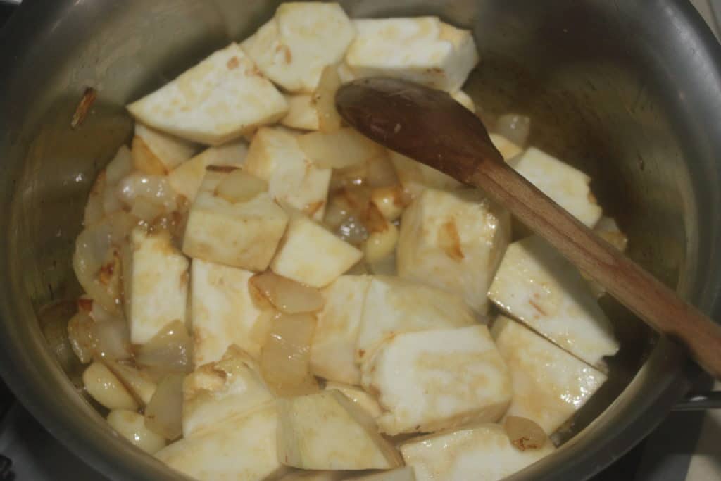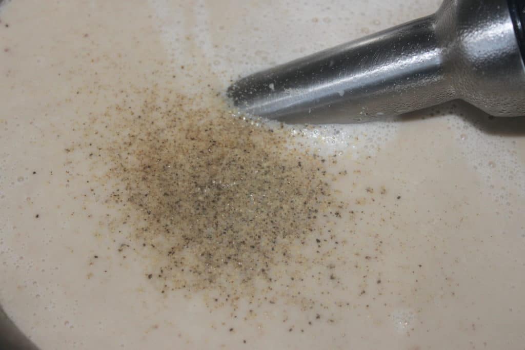 Pon sal y pimienta a tu gusto. Lo salé generosamente ya que las castañas le dan un sabor dulce.