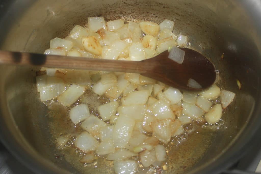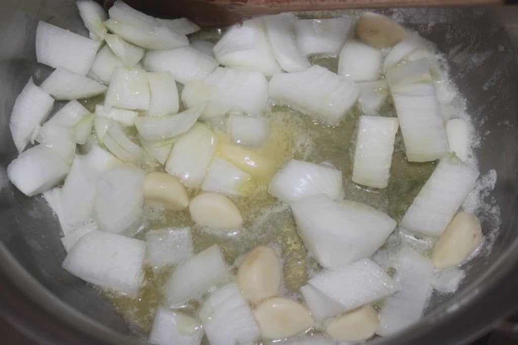 Poner la mantequilla, el aceite de oliva, la cebolla y los dientes de ajo pelados en una cazuela grande.