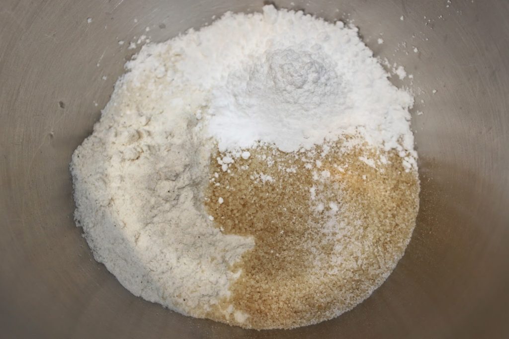 Mélangez la farine de riz complet, le sucre complet de canne et le sucre glace.