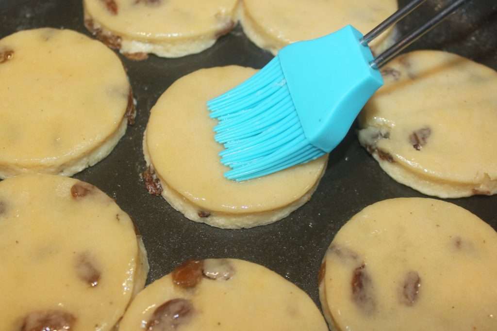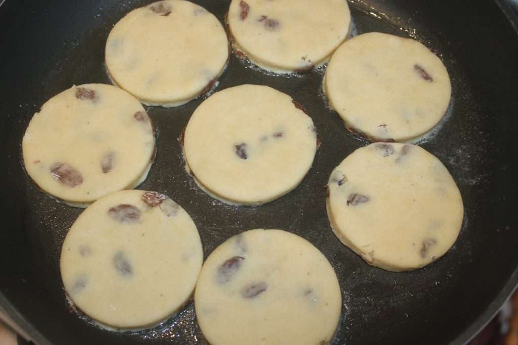 Calentar una sartén a fuego lento/moderado con un poco de mantequilla. Coloque algunos pasteles galeses en la parte superior.