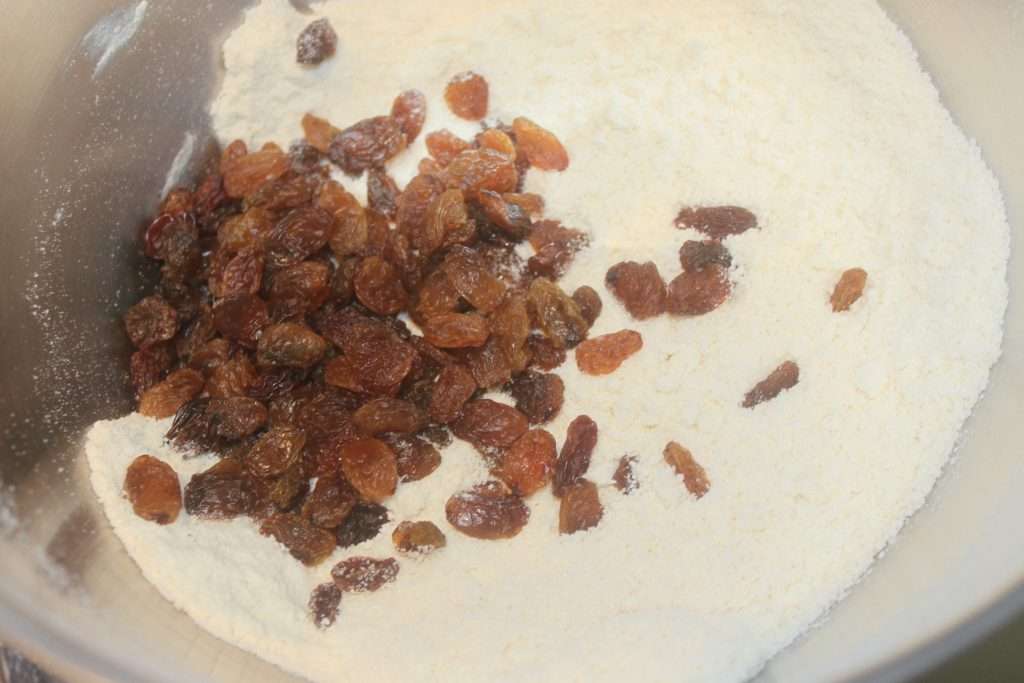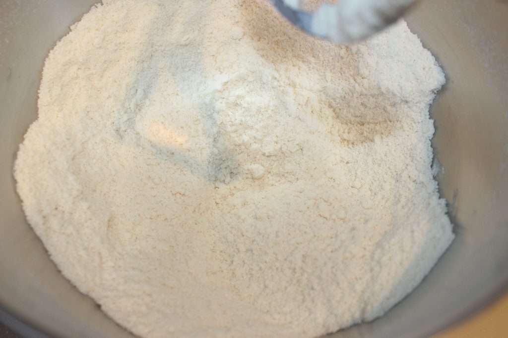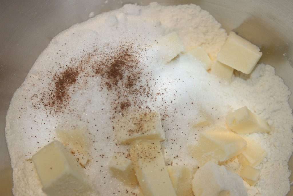 Poner la harina, la levadura en polvo, el azúcar y la mantequilla fría cortada en trozos pequeños.