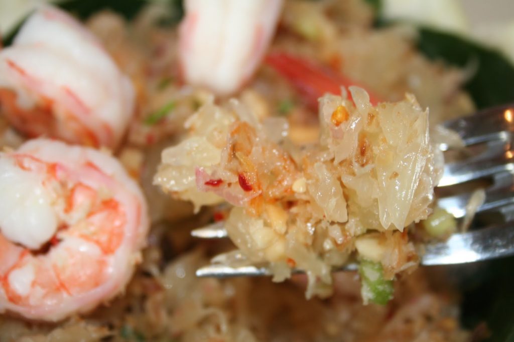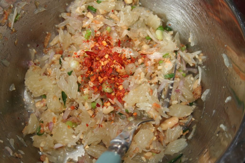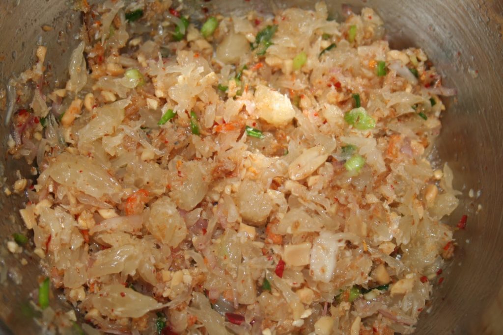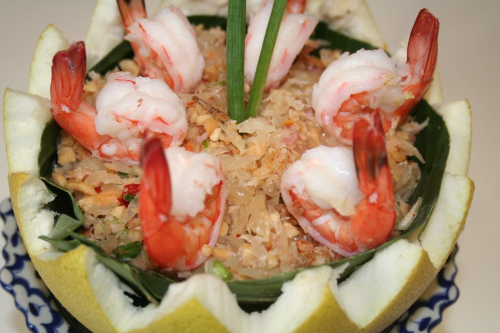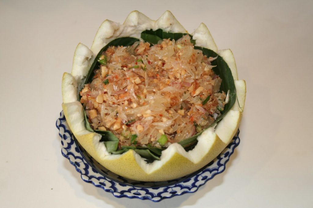 Esta entrada viene de Tailandia. El pomelo es la base. Dulce y picante, ¡todos los ingredientes son importantes!