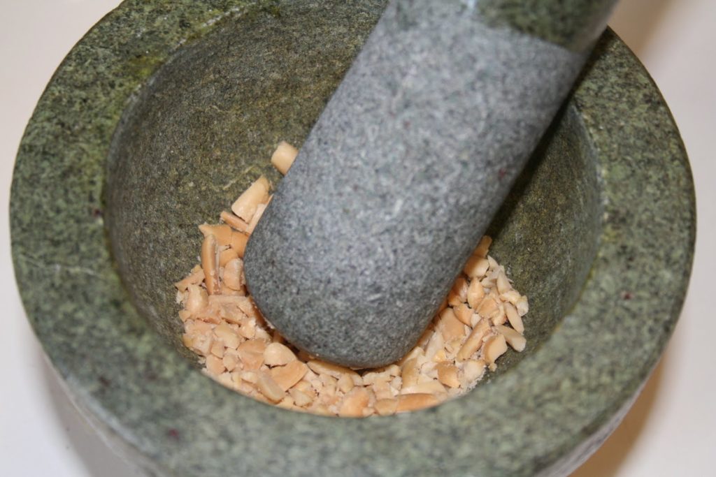 Triturar los cacahuetes en un mortero hasta obtener un polvo grueso.