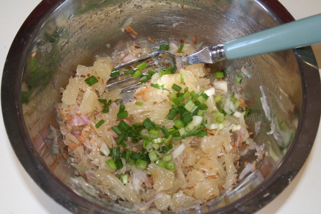 Añadir la pulpa del pomelo (¡180g! ¡no toda!). Añadir la chalota picada y el cebollino chino en trozos pequeños. Luego la chalota frita.