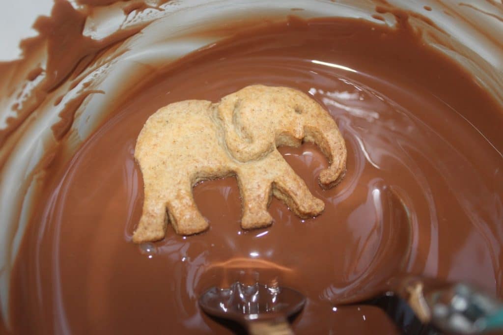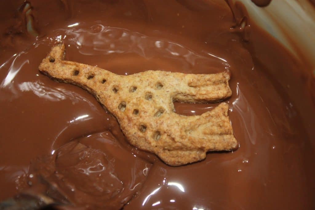 Vous pouvez vous passer du tempérage mais le résultat sera un peu moins joli. Quand le chocolat est prêt, enfoncez le sablé dedans en le retenant avec une fourchette.